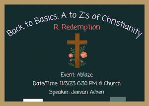 Join us as we continue our A to Z’s of Christianity and learn about Redemption! This is one of the most important concepts of Christianity…I’d say the most. 😀 We’ll only have one Bible study this month as YF will be preparing for Regional Retreat, so come and spend time with your brothers and sisters in Christ!