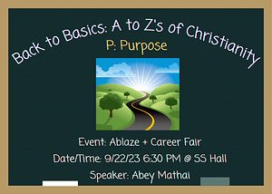 Join us as we continue our A to Z’s of Christianity and learn about Purpose…what are we really here for? What is God’s will and purpose for our lives? :O We’ll be hearing from one of our very own, Mr. Abey Mathai. After our usual Ablaze festivities, we’ll also be having a mini Career Fair where you’ll get to talk to some of our church members about their professions and why they went into those fields. Ask all your questions and learn something new!