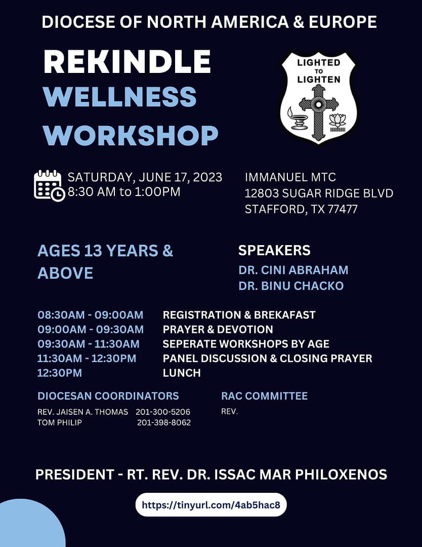 Our Diocese of North America & Europe has decided to conduct “Wellness Workshops” for the Mar Thoma churches in the nation. The Diocese asks various churches to host the workshop, and our sister church (Immanuel MTC) will be hosting the next one, SATURDAY June 17 from 8:30 AM-1:00 PM at IMC. Their flyer (which includes the workshop’s schedule) has been attached. They will be separating participants based on age (13-17 yrs old, 18-29 yrs old, and 30-50 yrs old) for the main workshop activities. The cost is $10/person. Please RSVP using their form below!