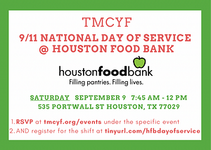Hey YF! Come join us at the Houston Food Bank for “9/11 National Day of Service” as we serve our Houston community! If anyone needs volunteer hours, this is a great way to get them!