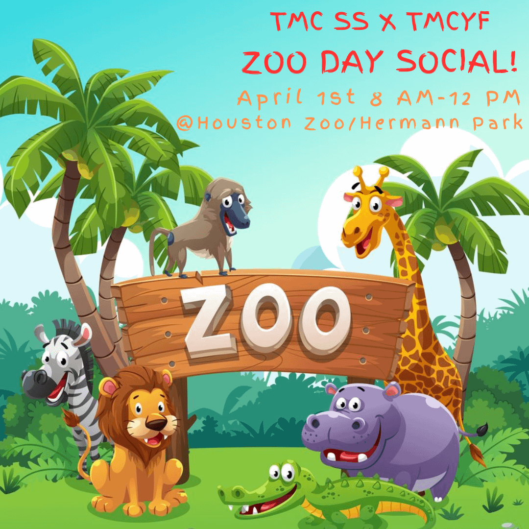 GUYS…WE’RE GOING TO THE ZOO!!! 😀 For our first social event of the year, TMCYF is joining up with TMC SS to go to the Houston Zoo Saturday April 1st from 8-12 PM ending with a picnic lunch at Hermann Park!! Come join us for some great fun & fellowship!